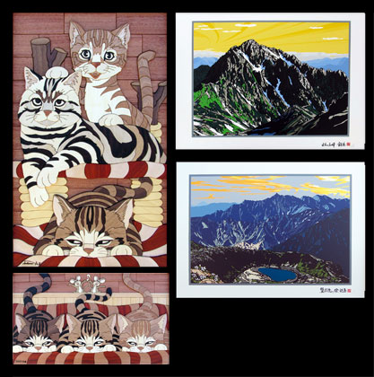 自然のままの木の色や木目を絵具と考え、板を切り磨き組んで仕上げる「木壁画」は、ほのぼのした温もりある作品です。