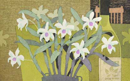 本荘さんの作品では、一作あたり15版から多いもので30版近く摺り重ねます。特徴は背景に「ゴマ摺り」やロウを使った技法で独特のムラをつくり、空間を表現しています。