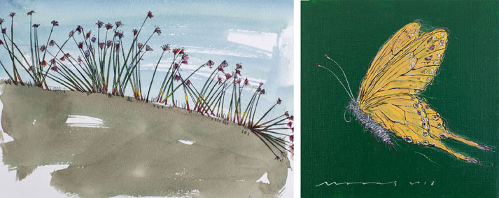 これまで日本関西地域を旅しながら、現場で描いた水彩画13作品と、花と蝶を題材として描いた20作品を展示します。