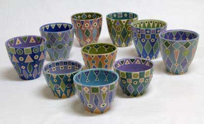 私の装飾方法はマスキングした上で、各々の色化粧土を塗るということを繰り返していきます。 細かい作業ですが、今のところはそうすることに面白さを見出しています。