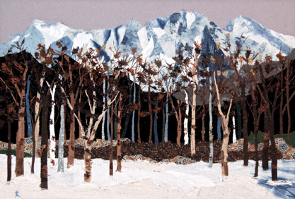 紬、ちりめん、絽など様々な布を貼り合わせて描く、懐かしい風景をお楽しみください。